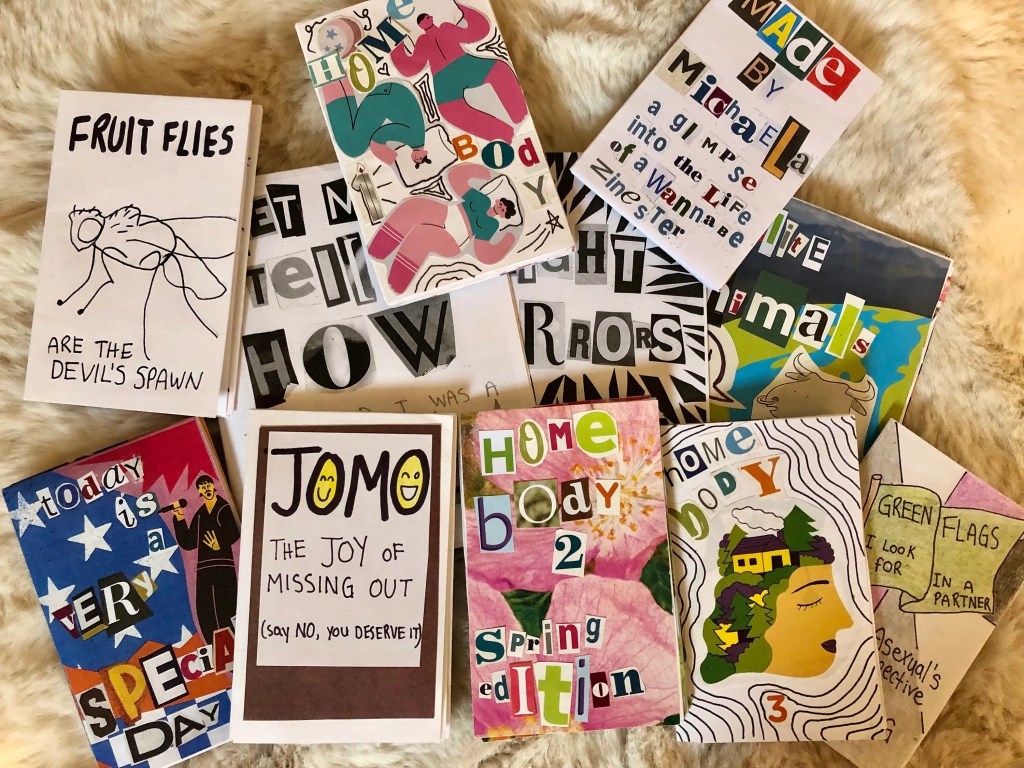 A zine (pronounced zeen) is a self-published booklet, created by artistically cutting and gluing text and images together onto a master flat for photocopying. Short for “magazine” although differing greatly in format, zines are often used to share tid-bits of information in a unique and independent way. They appear frequently in counter-culture and art-activism and are a fun, affordable artform to collect and make.